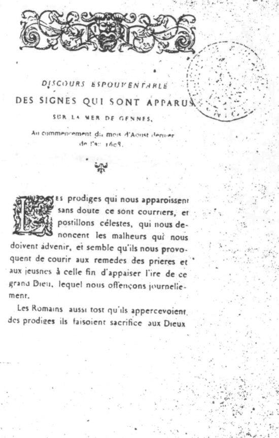 Discursos de los terribles signos aparecidos en el mar de Génova a principios de agosto con la maravillosa lluvia de sangre que caían del cielo en el lado de Niza y en varios lugares de la Provenza, la apariencia general de dos hombres en el aire que lucharon varias veces en la isla de Martigue, es una ciudad en el mar, a